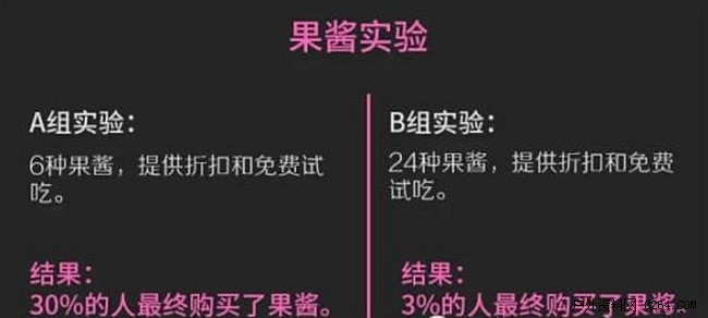 最后研究者发现,在提供6款果酱的组中,有30%的试吃消费者选择了购买;而在提供24款果酱的组中,只有3%的人最终选择了购买。
