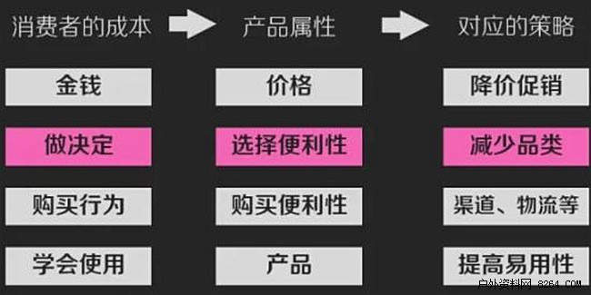 这些消费者成本所对应的产品属性是:价格、选择便利、购买便利、易用性。
