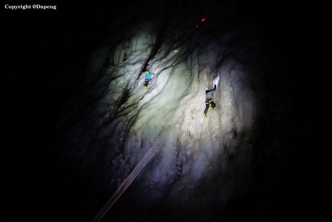 冰壁上夜攀的攀冰爱好者们