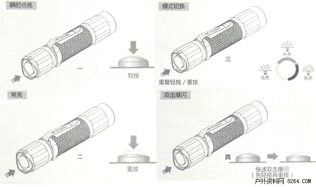 E5人性化设计,开关设计在手电尾部,并且一键多能,可以通过重复操作一个按钮切换点射、爆闪、常亮等多种模式,非常简单易操作。