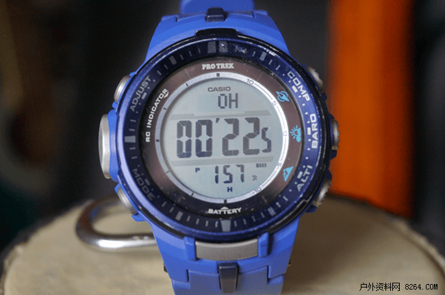 其实这个功能还是要实地操作试验一下才知道它的强大之处,现在只能告诉大家字面解释的意思。按手表右上角的“COMP”键就可以切换到这个模式。屏幕顶部显示的是目标方向,中部显示方位夹角,底部显示当前时间。这个功能在户外活动的时候绝对有很大用处。