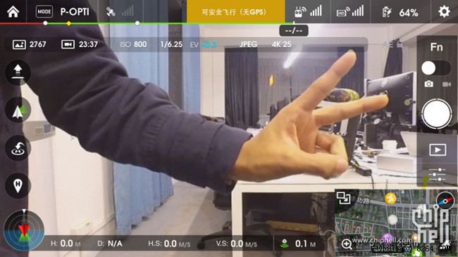 上面的图片就是直接链接输出第二个屏幕;外接屏幕中间的横线是飞行器此时的水平姿态,为了大家看得出,特意倾斜的,但画面是正的,因为云台在做功。
