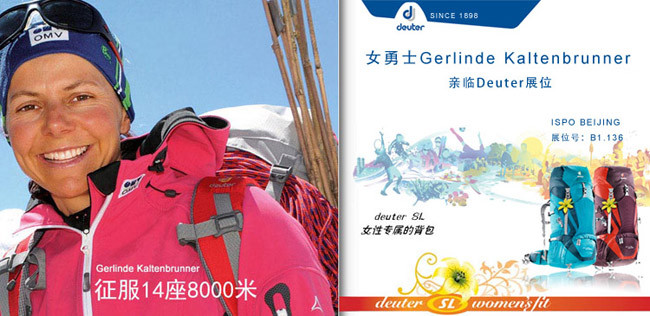 今年的北京ISPO汇聚了超过600个户外、滑雪、极限、运动时尚品牌,可谓是户外圈的"武林大会",此次,Deuter携2015年新品惊艳ISPO BEIJING,Deuter SL系列女性背包代言人奥地利著名女登山家Gerlinde Kaltenbrunner也亲临Deuter展位,进一步传达了女性背包的设计理念。作为全球首位无氧完登14座8000米级山峰的女登山家,她被认为是世界上最好的登山运动员之一,此次来到中国无疑是户外圈的大事件。