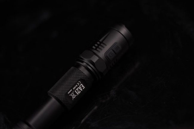EA21身材修长,风格黑色为主要基调十分深沉,电筒表面采用航天级铝合金制造,氧化涂层很细腻略有磨砂的质感。整体由黑色的硬质氧化表面耐磨处理,达到三级军用标准。筒身的滚花处理恰到好处,握感舒适,电筒筒身激光刻印清晰精细。