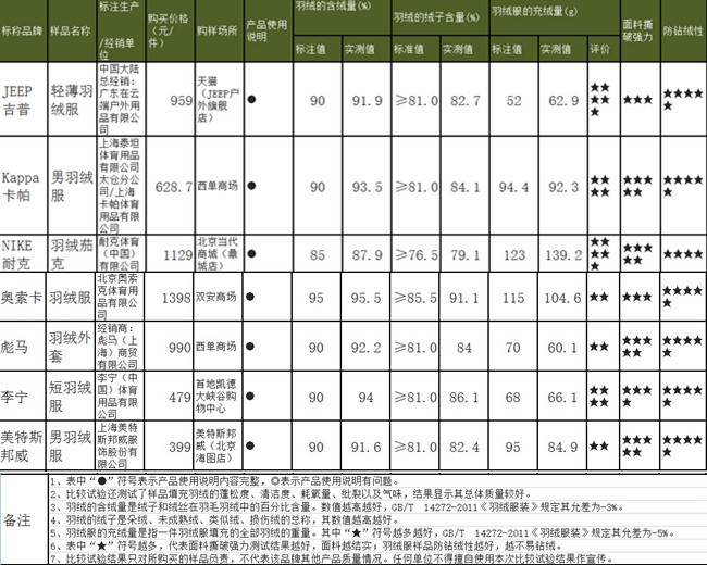 充绒量:此次比较试验的33款样品中,有7个样品的充绒量高于明示值,有12个样品实测充绒量较明示值低5%以上。