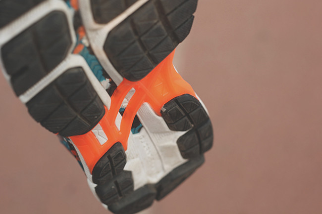 这样的优化旨在适应更多的跑步人群,此次FluidRide中底在原有基础上减少了约15%的重量,重量上的降低在跑步过程中对于人体的反馈比较明显。而整个中底不仅在重量上做出大幅度调整,在回弹反馈上增加原有基础的20%这样一来Kayano 21在传统的支撑与稳定之余又将其缓震效果提升,这样缓冲与回弹性能的巧妙结合使整双跑鞋更为趋近完美,可以显而易见的发现出现在中底的果冻状缓震胶更多更为明显,这便是缓震能力提升的一大信号。足跟位置Kayano 21也作出了调整,犹如骨骼状的支撑形态能更好的稳定双脚,带给我一个安心的跑步过程。