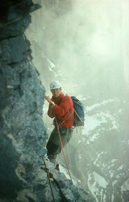 Chris Bonington生于1934年,17岁开始登山。1958年参与早期的Petit Dru的Bonatti Pillar线路攀登(译者:Petit Dru, Bonatti Pillar,TD+(VII+,A1) or ED3 (VIII free), 600m);随后成为第一个从北壁登顶Eiger峰的英国人。很快他被邀请参加喜马拉雅山脉的探险,并于1960年首登安娜普尔那II(Annapurna II 7927m),1961年首登努子峰(Nuptse 7861m)。1961年勃朗峰,Central Pillar of Freney路线(ED1 (V+,A1), 500m for the pillar, 700m to the summitridge),Central Tower of Paine (Patagonia, 1963, with Don Whillans),Righthand Pillar of Brouillard (1965, with Rusty Baillie, John Harlin, andBrian Robertson)。