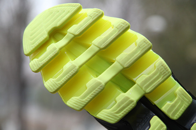 首先,adidas Springblade Drive 2呈现了较厚的鞋面系统,只在前掌位置使用了透气网面材质,除去前掌位置的鞋面系统提高了鞋面厚度,这样在温度较低的环境下穿着更有利于双脚保持温度。此外,在中足部位的“三道杠”使用了特殊手法处理在镂空处加入了3M反光元素,这样应对夜晚的跑步训练提升了不少安全系数,在灯光之下也更加夺目逼人。
