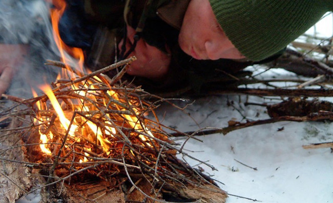 现在你可以生火了。选一个尽可能背风的位置,比如挨着大石头或者是山根儿底下。用你的防水火柴, FireKnife,镁棒或者是Jetboil炉来生火。当温度低于冰点的时候,打火机绝对指望不上。这也正体现出了防水火柴的伟大。