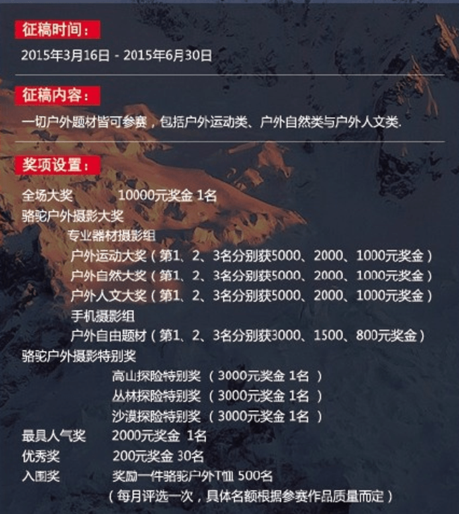 户外,就意味着挑战极限的激情、层出不穷的意外、造化神奇的自然、绝不作伪的真实。有太多瞬间值得珍藏,玩户外的人很多都在"实践出真知"的理论下修炼成了高超的摄影师,户外与摄影的结合,碰撞出了多少强烈的火花,诞生了多少精彩的作品,对大众而言,却总是"藏在深闺人未识"。独乐乐不如众乐乐,骆驼户外摄影大赛,就是号召所有的户外人士,拿出压箱底的宝贝,让大家开开眼!像这样专门为户外爱好者量身定做的摄影比赛并不多见,由非专门机构举办的更是罕有。如此兴师动众只为过户外瘾,还能最大范围传播户外精神,不得不再次感慨,霸道总裁才是真正的人生赢家!