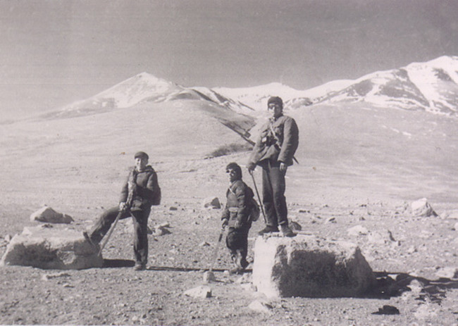 过河后我们继续赶路。寒风迅速将我们湿透的裤腿冻得梆硬!以至于走起路来吱哩咔嚓的直掉冰渣!我那双在推“冰船”时弄湿了的棉纱手套也早被冻成冰坨,以至于两手无法再待套中(后来也就一直裸手)。我们紧赶慢赶,总算按计划在十时以前到达甲冈山北麓。